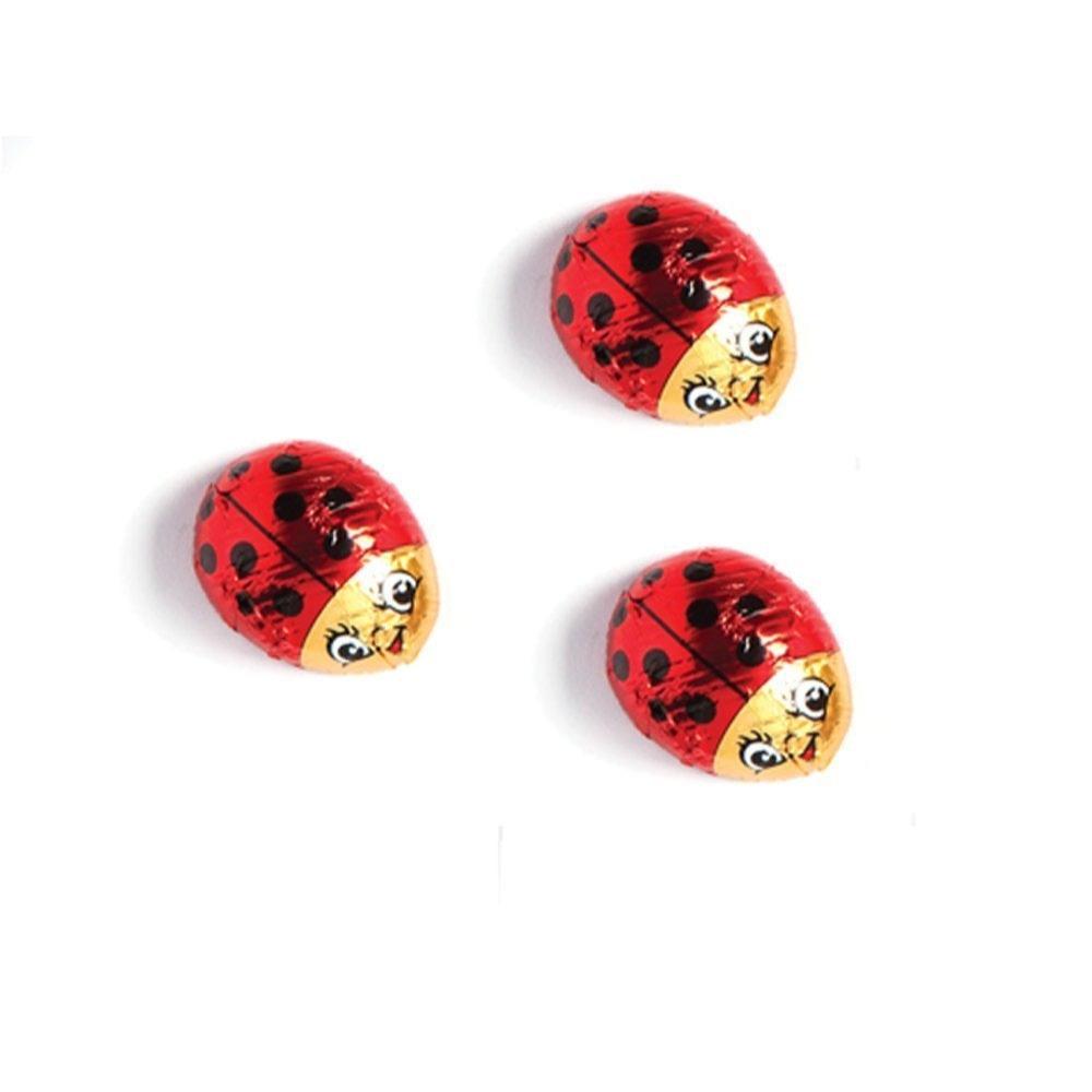 Solid premium milk chocolate lady bugs wrapped in cherry red and black Italian foil, featuring an adorable face.