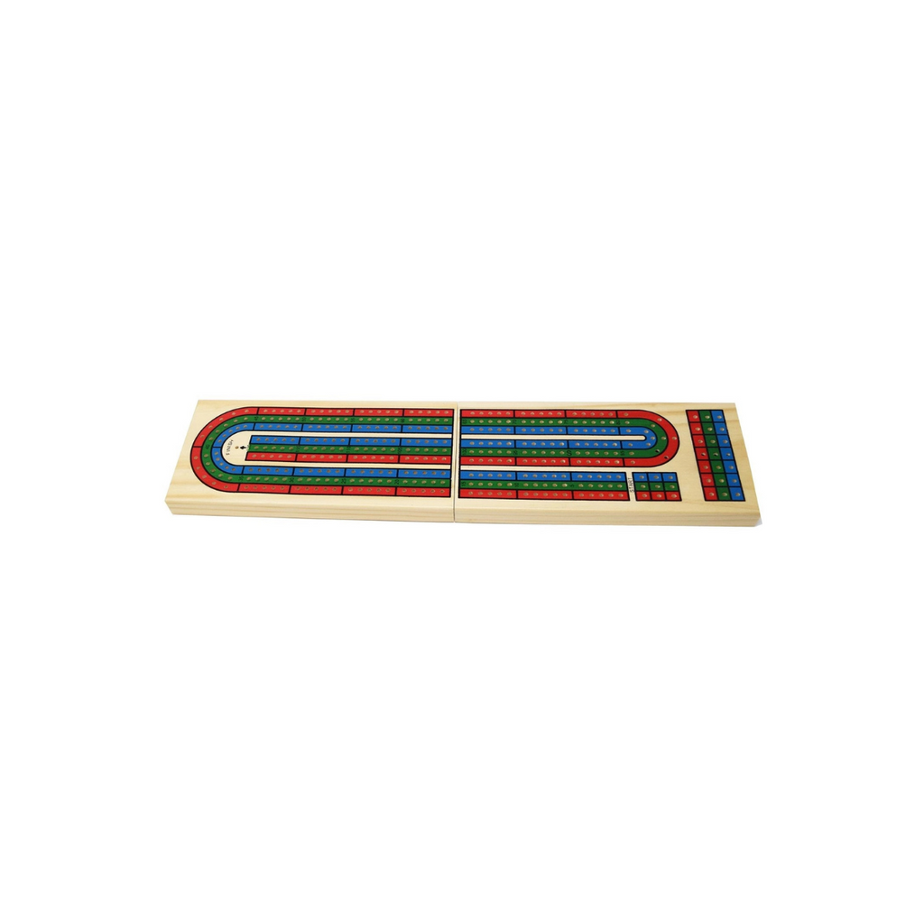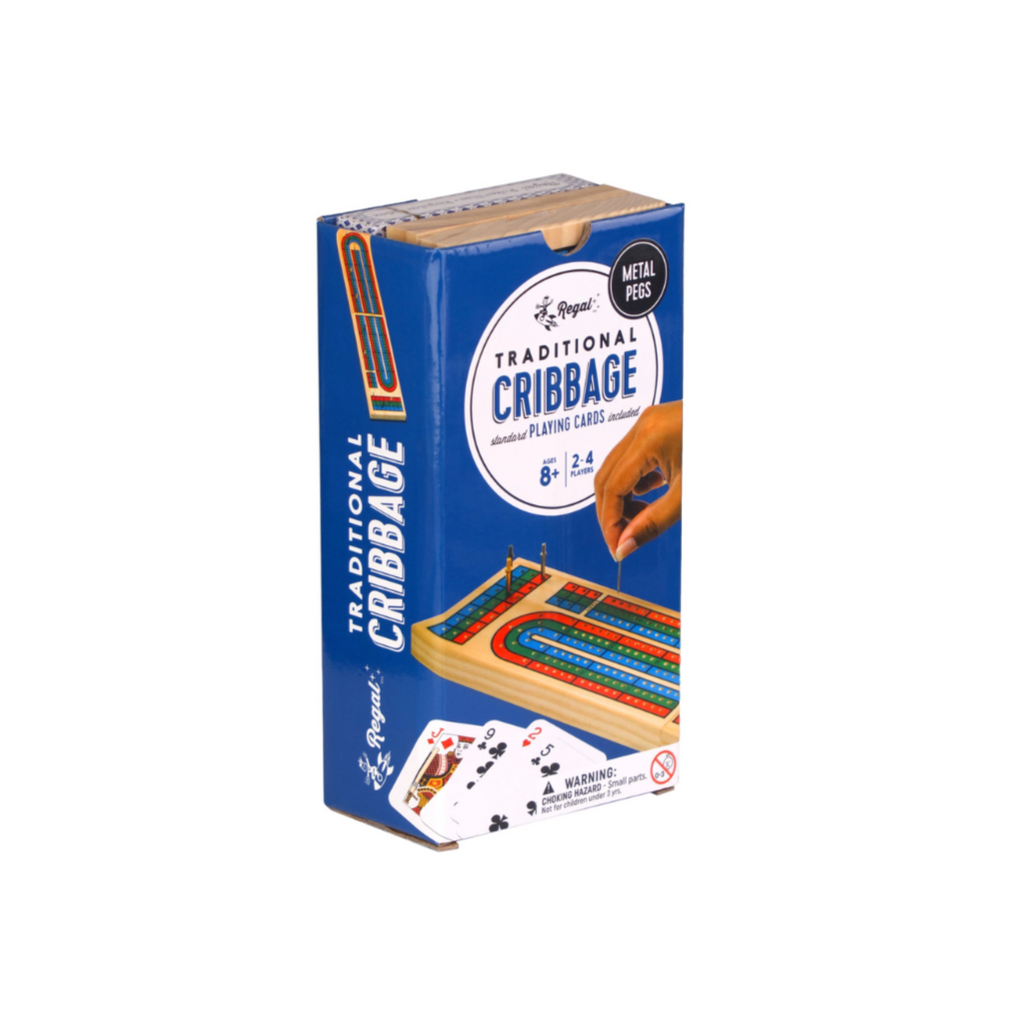 Regal Games Cribbage. Classic 3-track layout for 2-4 players. Foldable cribbage board, high-quality metal pegs, and a deck of Regal classic, high-quality playing cards. There are high-quality metal pegs in 3 beautiful colors, a solid wood playing board, and built-in storage when folded.