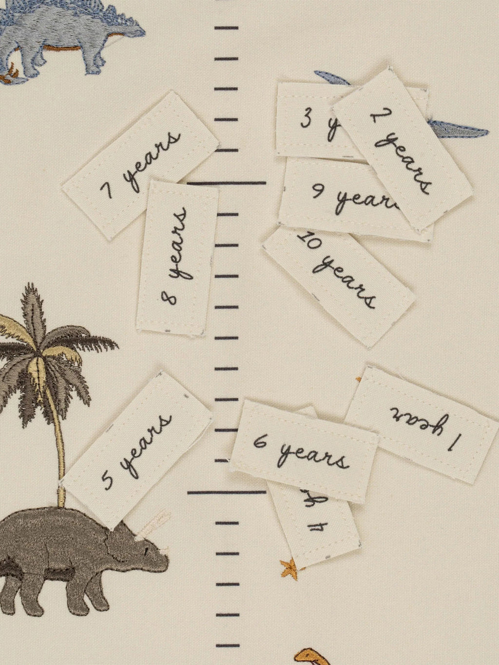 Super sweet growth tracker chart designed with embroidery and a practical rope at the top of the chart to hang wherever you please. Each chart comes with a set of canvas tags to iron on to the chart showing your child's height at different ages (1 - 10 years).