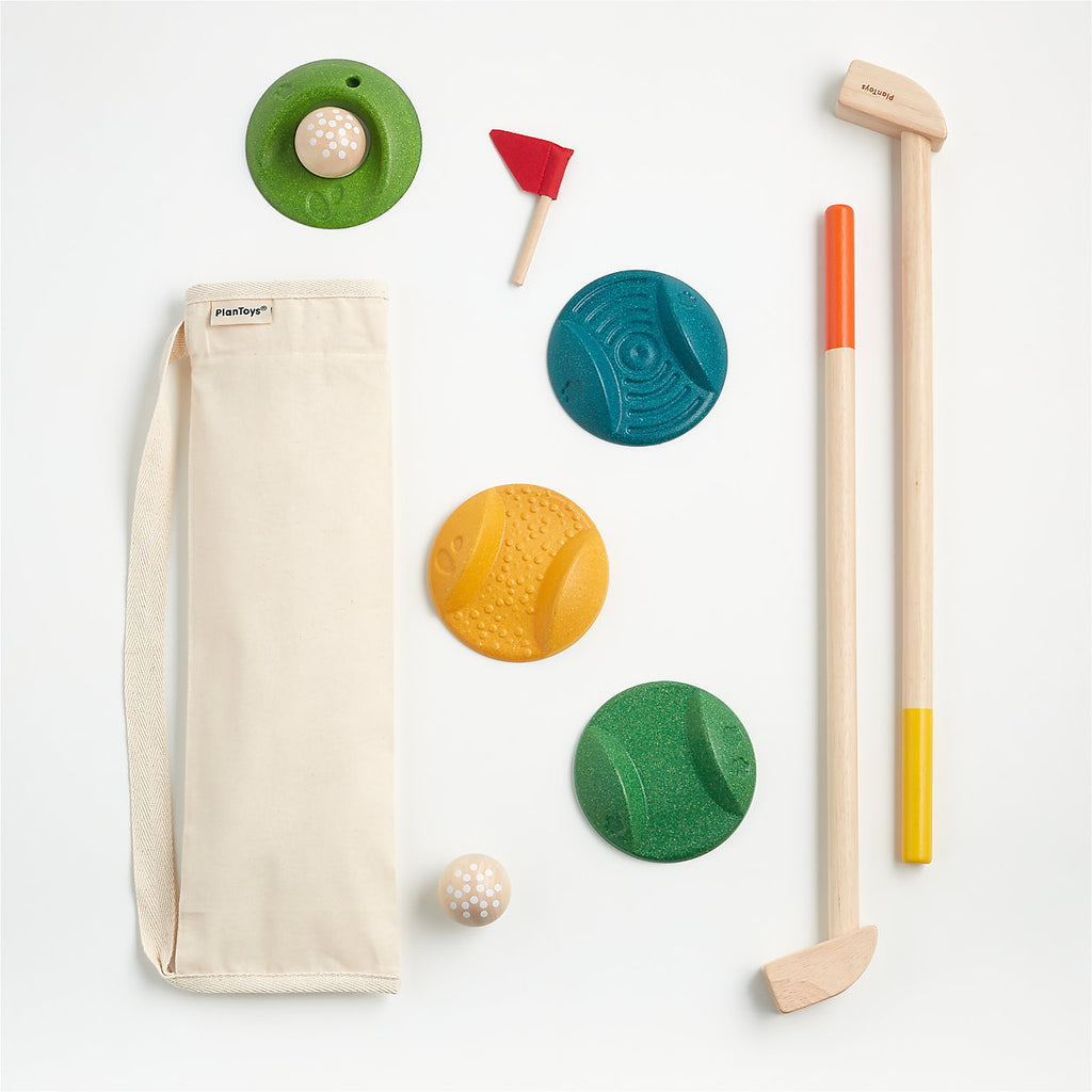 Play the golf sport game in the playroom or backyard. The Mini Golf - Full Set consists of 2 wooden kids-sized golf clubs, 2 wooden balls , 3 different types of challenging tracks and 1 hole. Ideal for 2 players. Bag included.