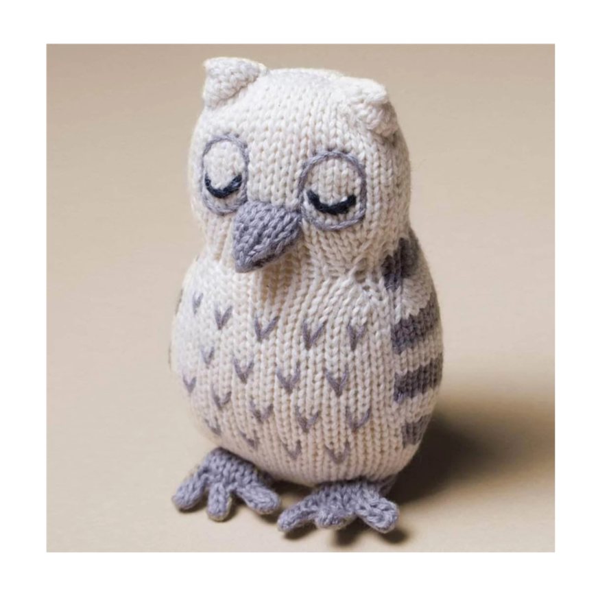 A wise and whimsical owl rattle made from soft organic cotton, perfect for nurturing curiosity.