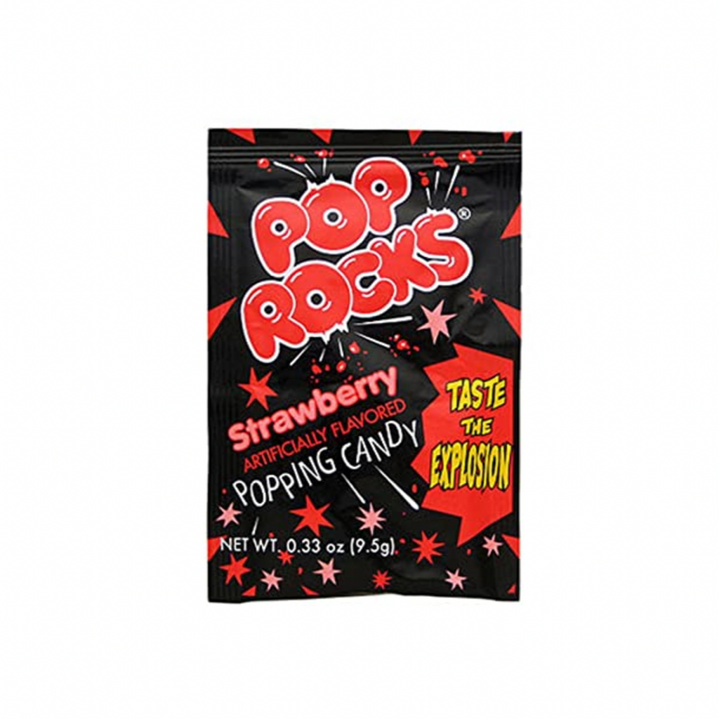 POP ROCKS® are small pieces of hard candy that have been gasified with carbon dioxide under super-atmospheric pressure. When these gasified sugar granules come in contact with moisture, in someone’s mouth or in a liquid, the gas retained inside the carbon dioxide bubbles is released, causing its characteristic popping sensation as well as crackling and fizzing sounds.