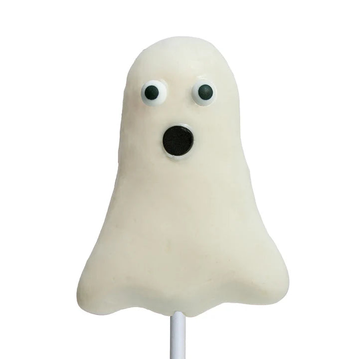 These grinning pumpkins, arching black cats and floating ghost shaped lollipops are sure to please the whole gang this Halloween. The pumpkins are orange, the ghosts are white cotton candy, and the cats are black cherry.