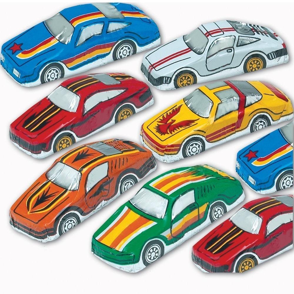 Solid 1 oz. premium milk chocolate cars wrapped in Italian foil featuring assorted race cars.