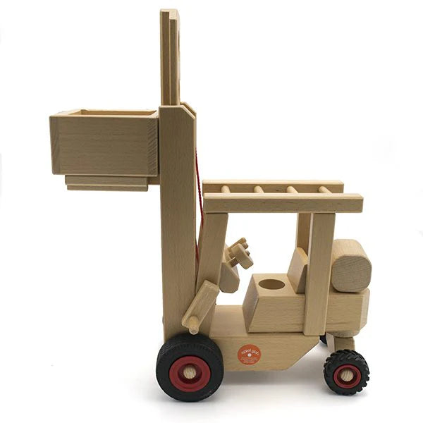 A wonderful working forklift, with two peg figures and a pallet to lift and load. The back wheels turn to direct the fork lift on its way. Awarded the Spiel Gut good toy designation.